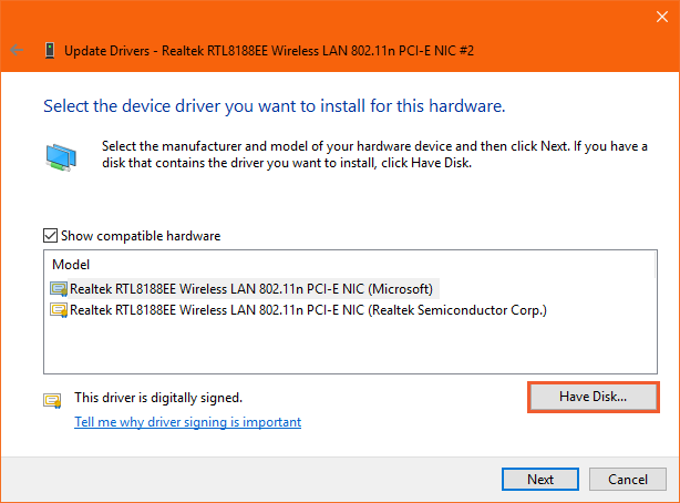 From the list of new drivers use the one which is marked on the screenshot: Realtek RTL8188EE Wireless LAN 802.11n PCI-E NIC