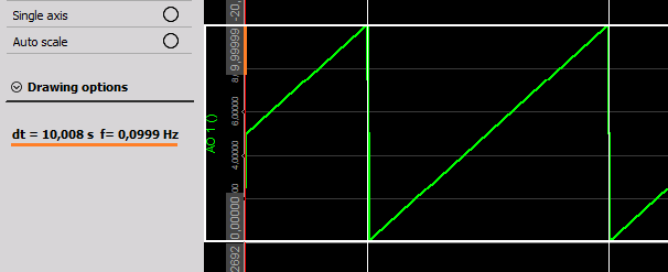 To get the signal that goes 0-10V in 10 seconds, you need to adjust the frequency to 0,1Hz and the scaling to "Direct".
